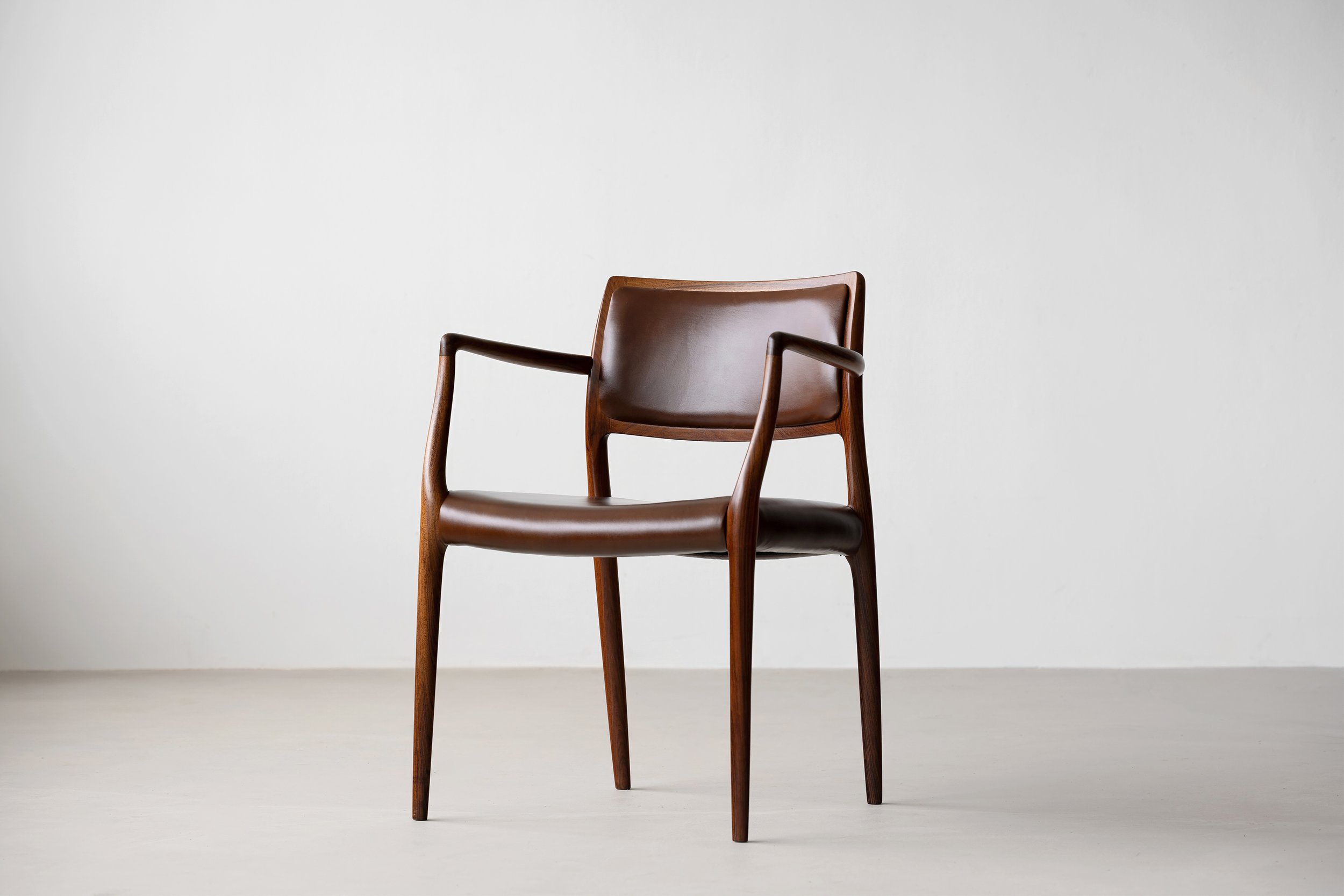 Niels Otto Møller (1920-1982) model 65 armchair in solid rosewood. We've restored this beautiful chair's frame and have upholstered the backrest and seat with new aniline leather. Designed in 1968, stamped and produced by J. L. Møllers Møbelfabrik.